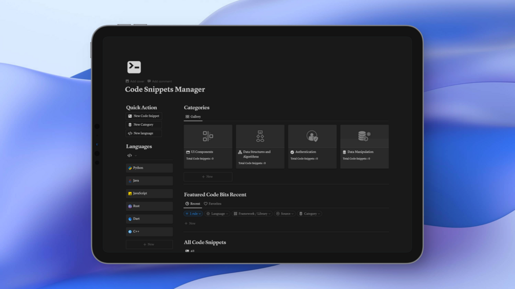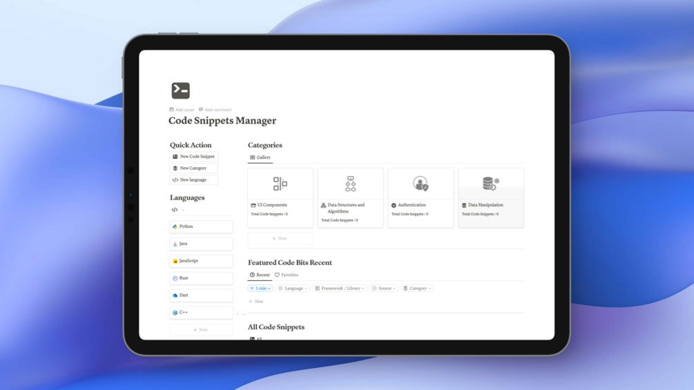 Don't let code clutter hold you back. Unlock the full potential of your coding skills with Notion Code Snippets Manager , your dedicated Notion code snippets manager. Experience coding efficiency like never before and embark on a journey to becoming a more organized, efficient, and knowledgeable developer.